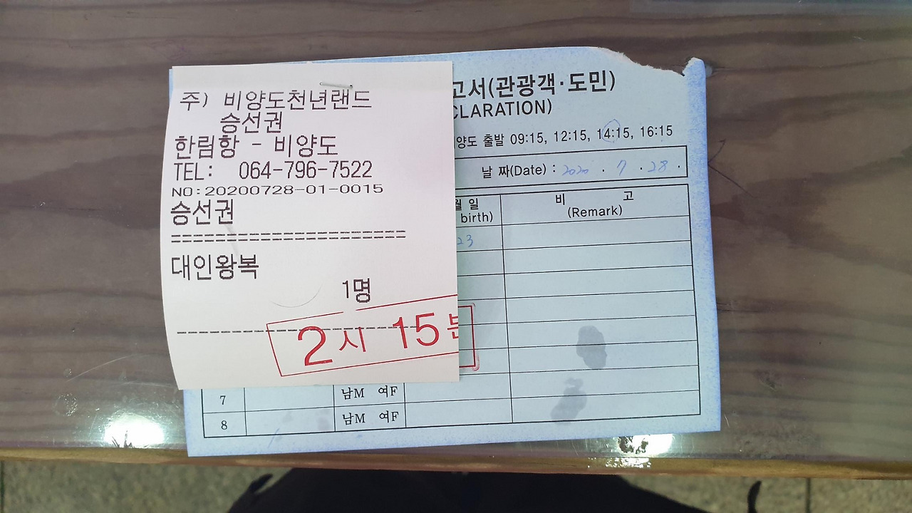"뒤에서 승선신고서 작성해 오시구요. 12시 배 맞으시죠? 11시 20분 배는 옆 창구에서 사셔야 해요."