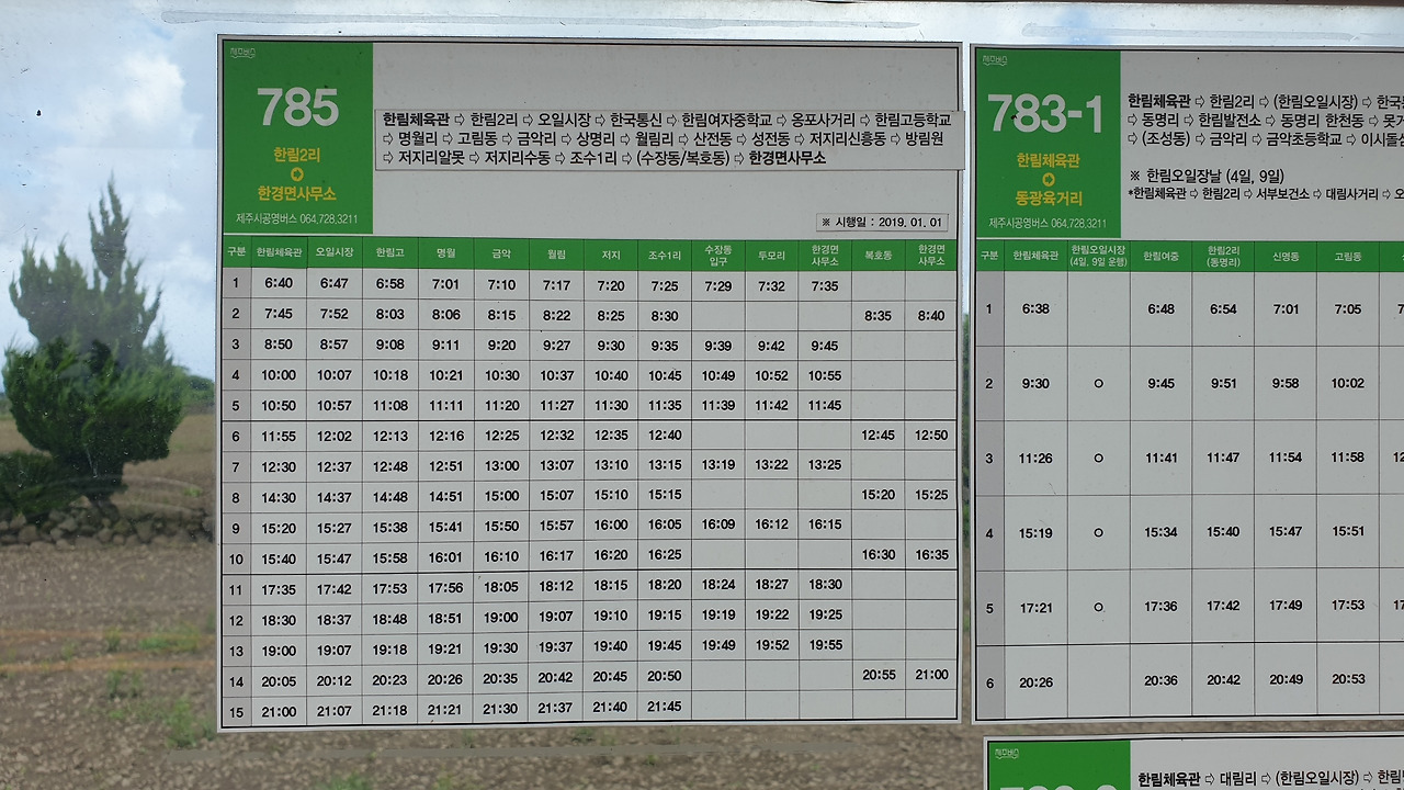 더마파크에 가기 위해서는 785번 버스를 타야 했다. 버스가 서는 정류장이 숙소에서 조금 떨어져 있었기 때문에 정류장에 도착했을 때는 땡볕에서 20여분을 걸은 뒤였다. 정류장에 도착한 후 이제는 조금 익숙해진 벽면의 버스시간표를 확인해보니 785번 버스는 대략 20분 안에 도착할 것으로 보였다.