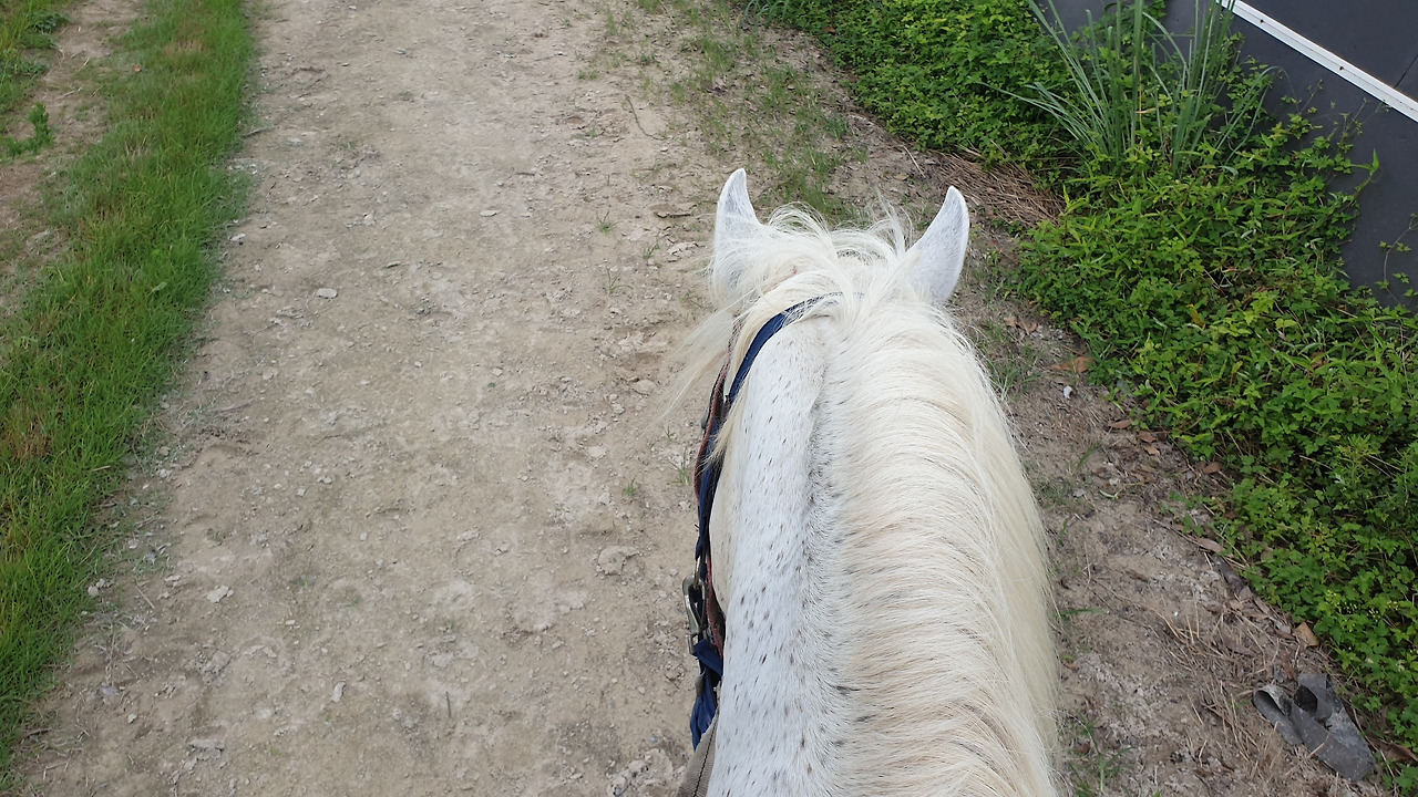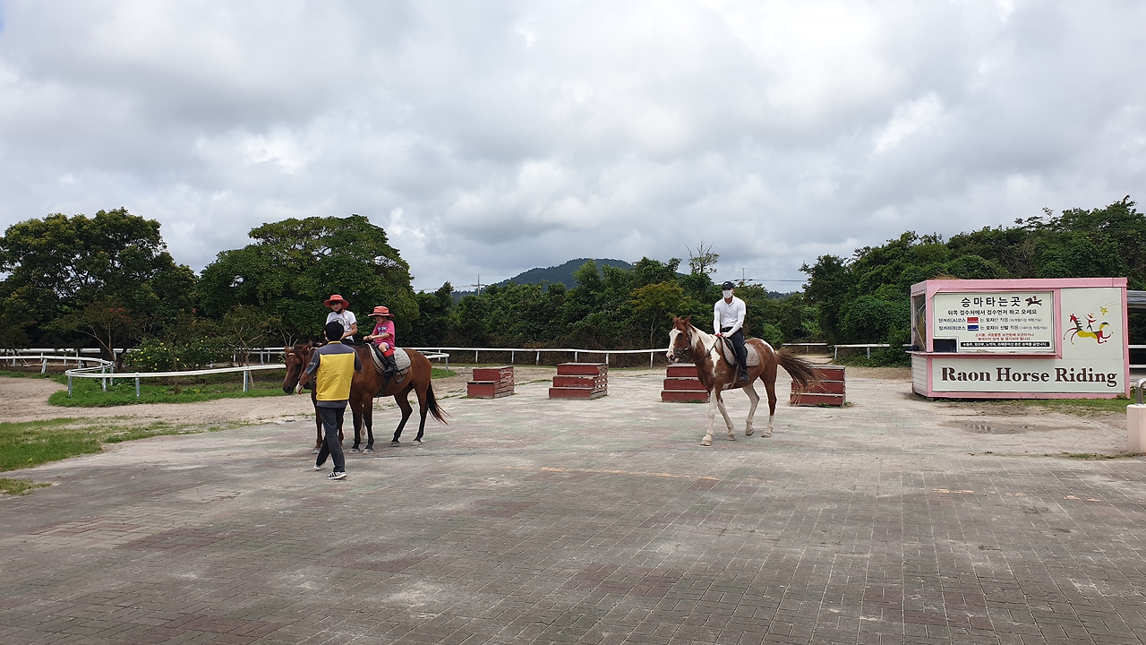 코스의 초입까지 걸어가니 한 가이드가 말 한 마리를 잡아끌고 와서는 계단 모양의 목재 구조물 옆에 그 말을 세웠다. 나는 3단 정도 되는 그 계단을 올라 말 등에 얹혀있는 안장에 살포시 내려앉았다. 안장에 앉은 나에게 가이드는 자세를 잡는 요령에 대한 간단한 설명을 해주었는데 그러고 나니 조금 전 벤치 옆에 서서 체험객들의 사진을 찍어주던 사진기사가 나를 향해 대포 카메라를 조준하고 있는 모습이 먼발치에서 보였다.