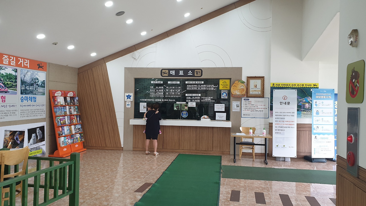 인터넷으로 승마체험 장거리 코스와 카트 체험을 이미 예약해둔 나는 곧장 매표창구로 갔다. 인터넷으로 예매를 했다는 나의 말에 직원은 어플 상의 바코드를 보여줄 것을 요청하였다. 두 가지 체험을 예약하느라 티켓도 두 장이었던 나는 바코드가 보이는 화면을 두 차례에 걸쳐 직원에게 보여주었고 직원도 마찬가지로 두 차례에 걸쳐 리더기로 바코드를 읽었다. 나의 예약정보를 전산망을 통해 확인한 매표 직원은 그 말 그대로인 창구(窓口, 창의 구멍)를 통해 실물 티켓 두장을 건네줬는데 그 티켓은 직사각형 색지를 코팅한 형태였고 그중 한 장은 빨간색, 그리고 다른 한 장은 초록색을 띄고 있었다.