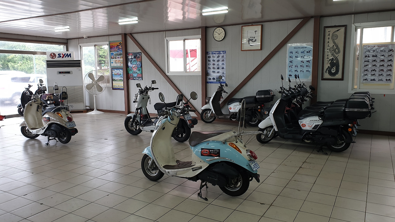 비를 뚫고 달려야 했던 그 당시의 아쉬움을 만회하려는 듯, 근 7~8년 만에 다시 스쿠터를 탈 생각을 하니 설레는 감정이 들었다. 게다가 이미 확인한 일기예보 상으로는 스쿠터를 빌린 3일 동안 비소식도 없었고 이전 며칠보다 화창한 날씨가 예상되고 있었다. 버스의 운행 경로상에서 공항을 조금 지나면 나오는 정류장에 내려 5분정도를 걸어가니 예약한 스쿠터대여점이 보였다. 삼각지붕의 대여점 안에는 몇 십대의 스쿠터가 가지런히 주차되어 있었고 예약자들을 기다리는지 몇몇 스쿠터는 아예 중앙 쪽으로 나와있었다.