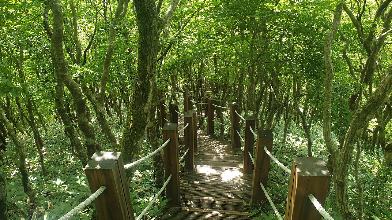 삼림이라는 단어에서 '삼'자의 뜻이 나무 빽빽함(森, 나무 빽빽할 삼)이라는 것을 증명이라도 하듯 숲 속은 온 세상이 초록으로 뒤덮여있었다. 사람이 지나다니며 자연스럽게 길의 지위를 얻은 것 같은 흙길을 걸을 때도, '이곳은 자연 그대로의 모습으로서는 인간이 영위하기 곤란하다'는 판단으로 나무 데크로 계단을 만들어 둔 것 같은 인공의 길 위에서도 주변은 한결같이 모두 우거진 나무들이었다. 길이 스스로 자신이 길임을 규정하는지, 아니면 숲의 공백으로 그 길이 규정되는지는 모르겠지만 이미 진입한 숲 속의 길은 여행객을 빨아드리는 듯했다. 그런 길 위에서 앞으로 나아가는 것에는 적당한 이유가 없다. 길은 누군가가 그 위를 걷고 있을 때 비로소 길로써 존재하기에 굽은 숲 속의 길을 계속해서 걸었다.
