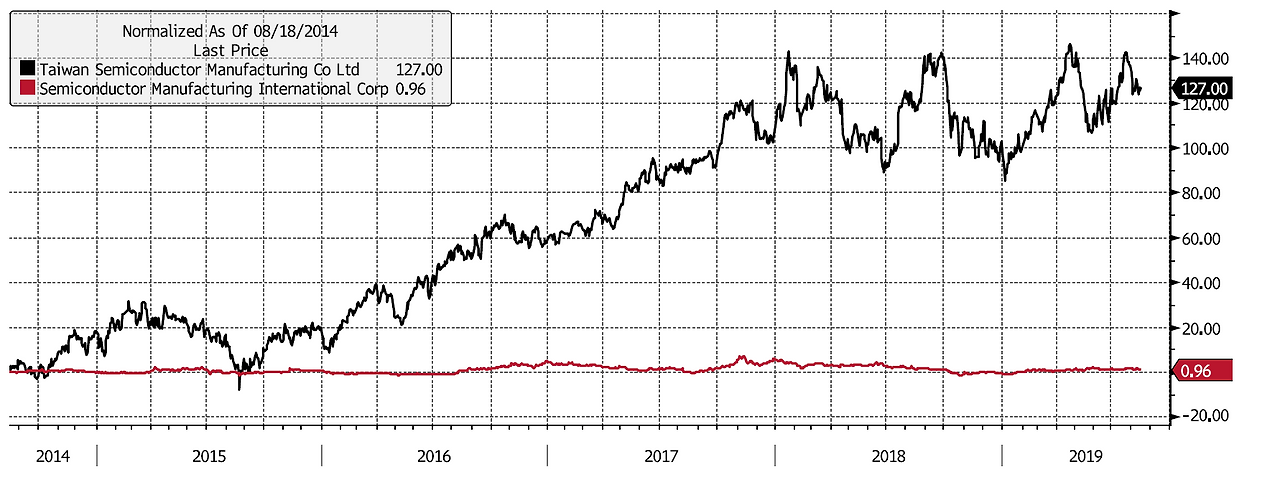 TSMC(검), SMIC(빨)의 수익률 차트. 중국 정부의 처절한 노력이 얼마나 무의미했는지 보여준다. 출처: Bloomberg