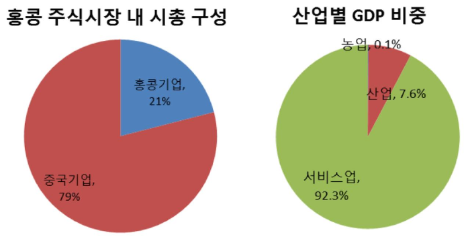 특별행정지구(SAR: Special Administrative Region)로서 글로벌 자본시장과 철저한 자본통제를 받는 중국 사이에서 징검다리 역할을 해주는 금융업이 대부분이다.