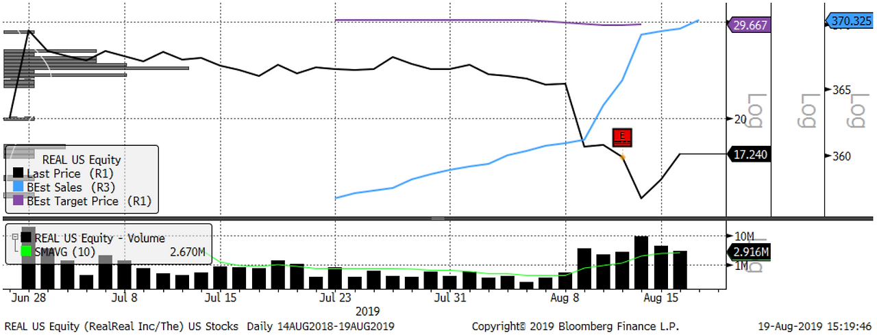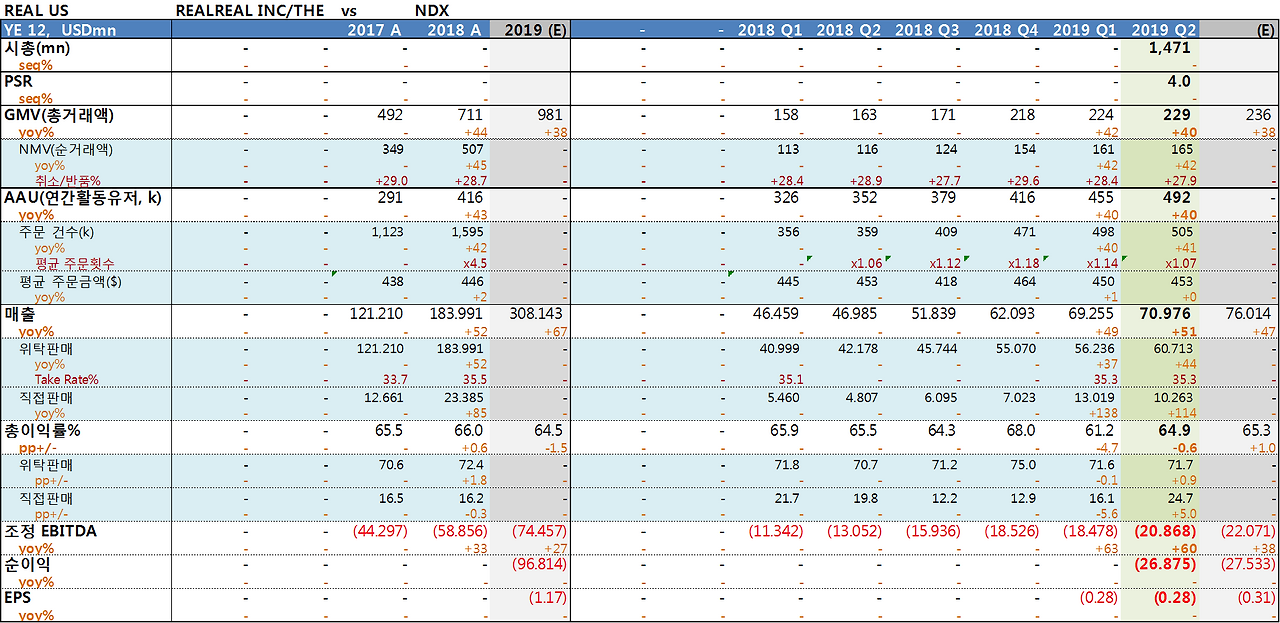 The RealReal은 '19년 8월 14일, 상장 후 첫 실적을 발표하였다. 실적의 핵심인 매출이 시장 애널리스트들의 기대치 중 최고치도 상회하였고, EBITDA 적자는 기대치 중 최저치 보다도 적게 나왔다. 회사의 연간 전망도 기대치를 상회하였다.