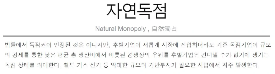 인류 경제 역사상 이들은 자연독점(Natural Monopoly)이라는 개념에 가장 부합한다. 경제 교과서에서는 자연독점의 예로 발전업체 같은 기간산업을 드는데, 발전업체도 어느 정도 이상 커지다 보면 반드시 비효율이 발생한다.