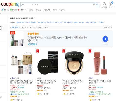 네이버 쇼핑인사이트에서 트렌드 분석을 통해 '헤라블랙쿠션'의 검색 키워드 순위가 올라가고 있는 것을 확인하였고, 해당 제품은 실제로 네이버 스마트스토어와 쿠팡에서 판매가 빠르게 증가하고 있었습니다.