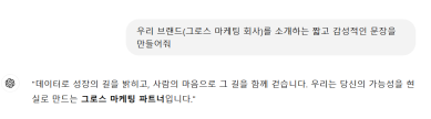 “우리 브랜드(그로스 마케팅 회사)를 소개하는 짧고 감성적인 문장을 만들어줘.” LLM은 학습 데이터를 기반으로 적절한 어휘와 문장 구조를 조합해 독창적인 문구를 생성합니다.