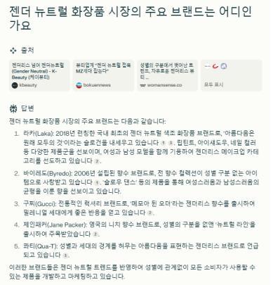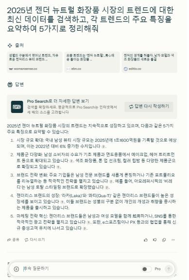 예시 프롬프트 : “2025년 젠더 뉴트럴 화장품 시장의 트렌드에 대한 최신 데이터를 검색하고, 각 트렌드의 주요 특징을 요약하여 5가지로 정리해 줘”