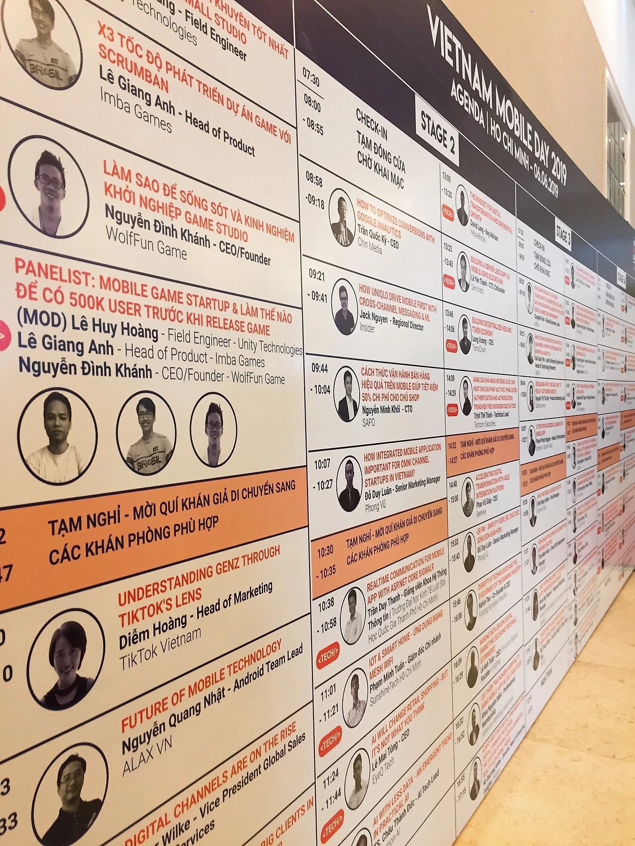 컨퍼런스의 세션 일정이 입구에 펼쳐져 있었는데 발표마다 발표자의 사진이 붙어있었다. 한국의 컨퍼런스는 발표자의 실제 모습을 전면에 드러내지 않는다. 웹 자료의 경우 포함하더라도 오프라인 팜플렛의 경우에는 종이로 본인의 사진이 돌아다니는 걸 선호하지 않는다. 굳이 배포 자료에 포함하지도 않는다. 하지만 베트남에서는 마치 모두 인물 사진을 넣었는데 굳이 배제한 발표자가 있다면 더 눈에 띄는 양상이다.
