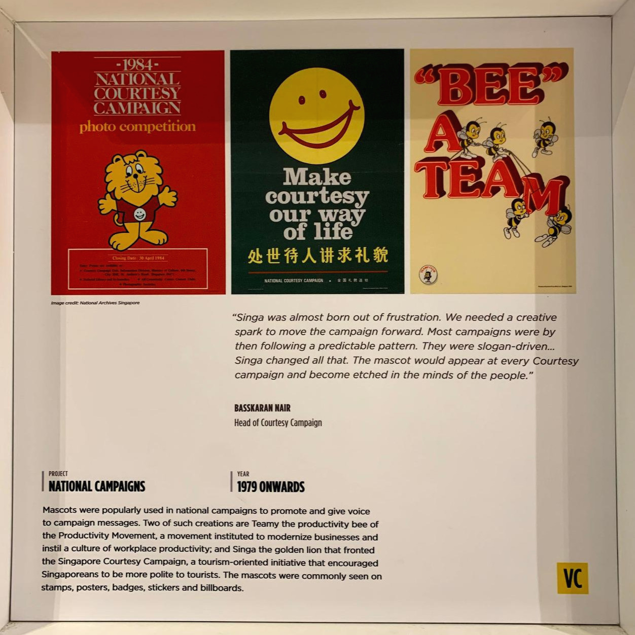 오른편의 포스터에서는 자국민을 향한 선도적인 목소리가 지나치지 않게 전달된다. 귀여운 사자 캐릭터가 매너 있는 시민이 되자는 "National Courtesy Campaign"의 무게를 일상의 수준으로 낮춰 주고, "Make courtesy our way of life" 라며 외치는 웃는 노란 얼굴에 싫다며 인상 찌푸리기 어렵다. "Bee a team"이라는 언어유희와 꿀벌들은 너무 귀여워서 발걸음을 멈추고 카메라를 꺼내게 했다. 매우 간단한 디자인을 더해 효과를 극대화한 성공적인 광고이자 교육이다.