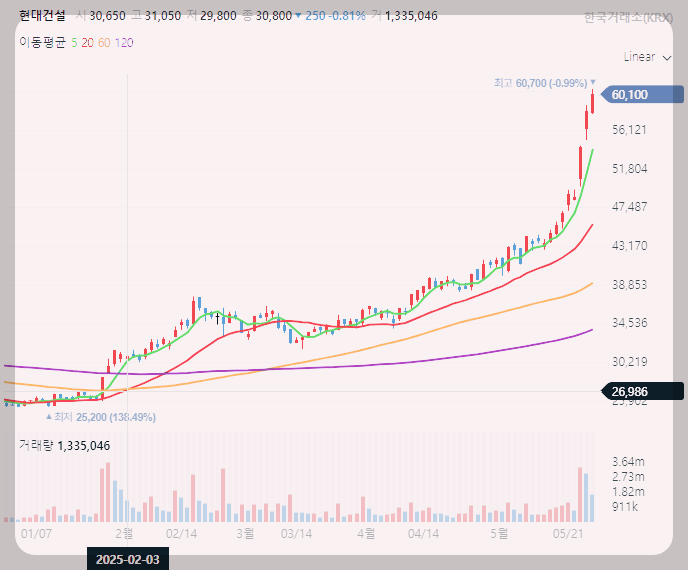현대건설의 주가 차트를 보면, 2025년 초 골든크로스 발생 후 주가가 꾸준히 상승세를 타며, 25년 상반기에만 3배가냥 모습을 보였습니다. 이처럼 골든크로스는 장기 상승의 시작점이 되는 경우가 많습니다.