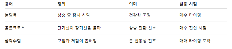 주식 차트를 보다 보면 수많은 선과 패턴이 그려져 있어 처음에는 복잡하고 어렵게 느껴집니다. 하지만 몇 가지 핵심 개념만 정확히 이해해도 훨씬 수월하게 흐름을 읽을 수 있습니다. 그중에서도 눌림목, 골든크로스, 삼각수렴은 매매 시점을 잡을 때 매우 유용한 개념입니다. 이 글에서는 각 개념의 정의와 함께 실제 차트 예시를 시각적으로 이해하기 쉽게 설명합니다.