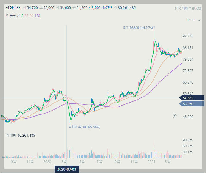 삼성전자 주가가 장기적으로 우상향 흐름을 보일 때도 중간중간 눌림목이 나타납니다. 예를 들어, 2020년 상승장 당시 5만 원에서 6만 원까지 빠르게 상승한 후, 잠시 4만원대까지 조정을 받았지만 이후 8만대까지 올라가는 흐름이 이어졌습니다.