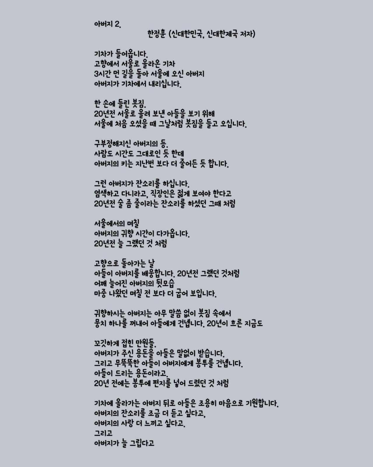 이 시는 한정훈 작가가 저를 위해 써 준 두번째 시입니다. '아버지'라는 워딩을 가지고, fiction으로 창작한 시입니다. 한정훈 작가는 RIDI 역사 소설 부분 1위 작품인 '신대한민국'과 '신대한제국'의 저자입니다. 글을 빠르고 간결하고 명확하게 쓴다는 점에서 뛰어난 능력을 가진 작가입니다. 개인적으로 친한 형님이시기도 하구요.