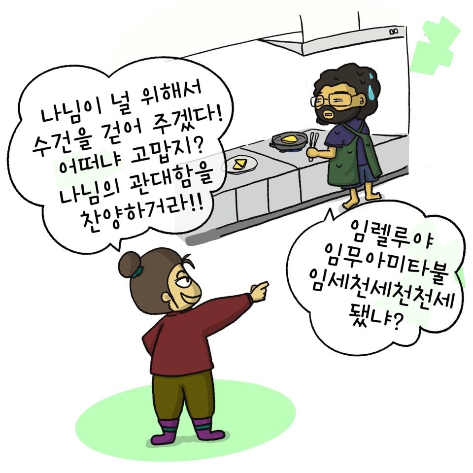 "그래? 아랐쒀. 나님을 위해 식빵튀김을 준비하고 있으니 특별히 도와주지.