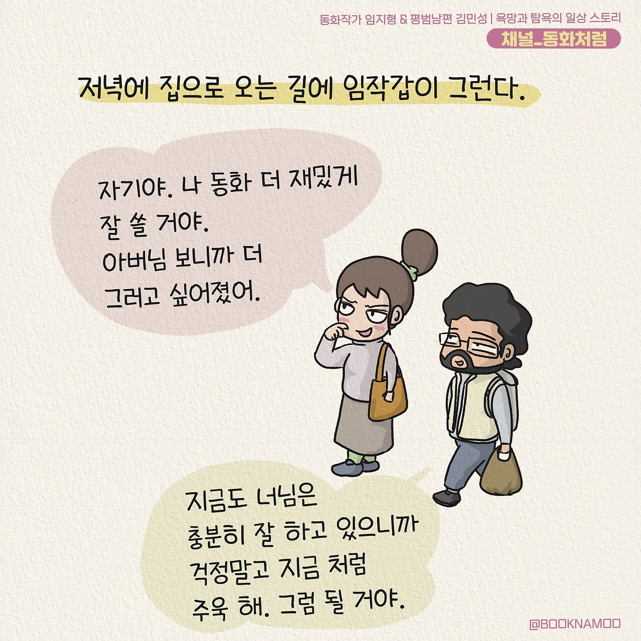 “자기야. 나 동화 더 재밌게 잘 쓸 거야. 아버님 보니까 더 그러고 싶어 졌어.”