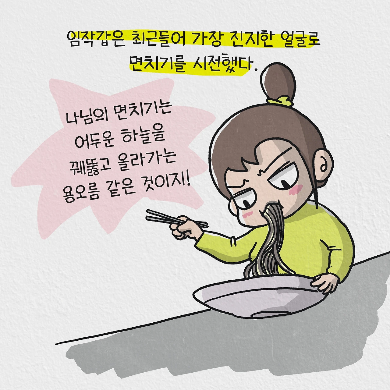 오른손으로 집어 든 면을 입에 한 입 넣더니,