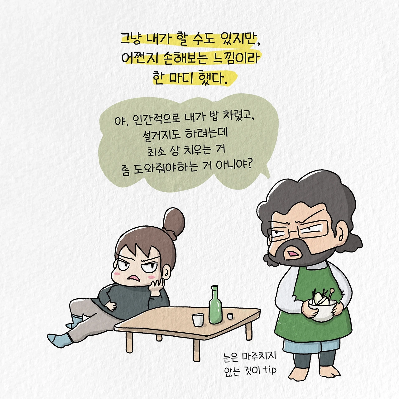 저녁을 먹고 나서 설거지 하려고 그릇 치우는데,임작갑은 노는 언니들 보면서 누워 있더라.양심이 있으면 좀 도와야 하는 거 아니냐고 했더니알았다며 몸을 일으켰다.그러더니 병을 집어든다.나를 스윽 보고는, 병 목을 움켜 쥐더라.뭐, 뭐냐!지는 원래 그렇게 병을 치운단다.구라쟁이.임작갑의 양심은 물리력으로 나타나는 모양이다.병목현상 개객끼.