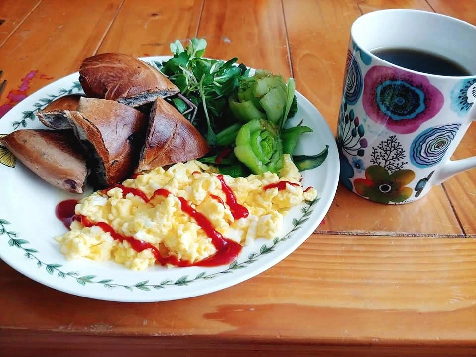 여튼 집에 와서 계란에 우유를 넣어 풀고, 팬에 버터를 두른 후 스크램블을 만들었다. 남은 열로 올리브유를 두르고 청경채를 살짝 볶았다. 에어프라이어에 베이글을 구웠고, 새싹채소는 살짝 씻어 접시에 담았다.