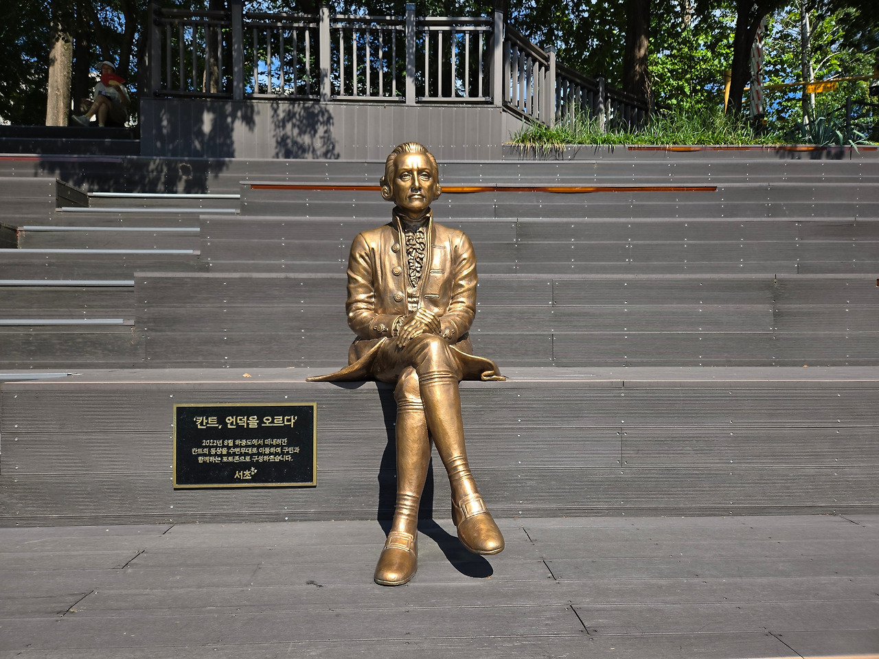 이 섬에 있던 책 읽는 모습의 칸트 동상은 2022년 8월 폭우 때 떠내려가고 지금은 수변 무대 앞 계단형 객석에 두 손을 포개고 앉아 있는 칸트를 볼 수 있다. 칸트는 ‘걸어 다니는 시계’라는 별명이 붙을 정도로 규칙적인 습관을 가진 사람으로 유명하다. 편두통을 앓으면서 산책에 집착했는데 시간도, 코스도, 걸음수도 항상 같았다고 한다. 산책 외에도 그가 철저하게 지켰던 바른생활 루틴에는 강의, 토론, 글쓰기가 포함된 것으로 알고 있다.