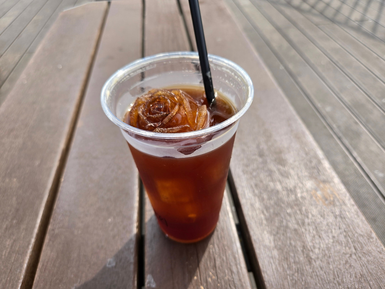 돌아오는 길에 더위도 식힐 겸 장미테마길 입구 쪽에 있는 ‘장미카페’에 들렀다. 후덥지근함을 참기 어려워 평소에는 잘 마시지 않는 아이스커피를 주문했다. 키오스크로 주문을 하니 메뉴에 있는 ‘장미얼음’이 무엇인지 물어볼 수도 없어 무작정 추가했는데 가게 밖에 피어 있는 장미 못지않게 예뻤다. 장미 한 송이쯤 되는 크기의 커피색 얼음이었는데 덤으로 얻은 시원한 행운이었다.
