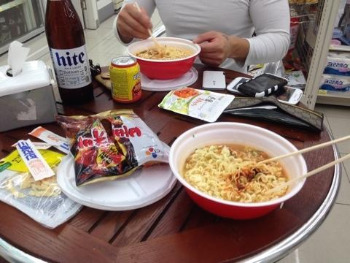 "오늘은 돈도 못 벌었으니 컵라면이다"라고 말은 했지만 사실 컵라면을 둘 다 좋아하는 편이라 편의점으로 가서 컵라면과 냉동, 그리고 맥주까지 샀다.