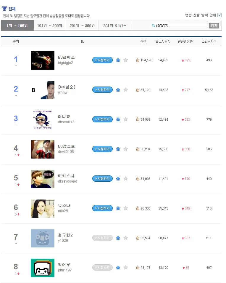 먼저 지금 순위권에 있는 방송하는 분들의 랭킹이 궁금했다. 1~15위까지만 캡처. 그중 내가 아는 사람은..