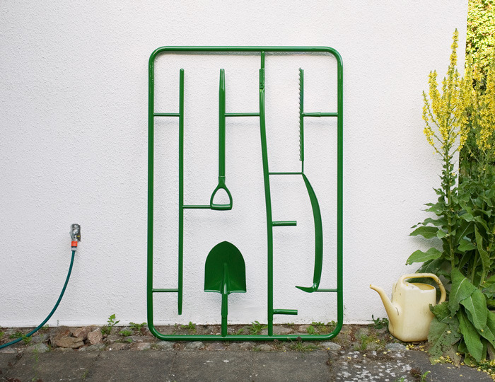 Spade, rake, scythe, welded metal frame, spray paint, 1.1 x 1.6 m.