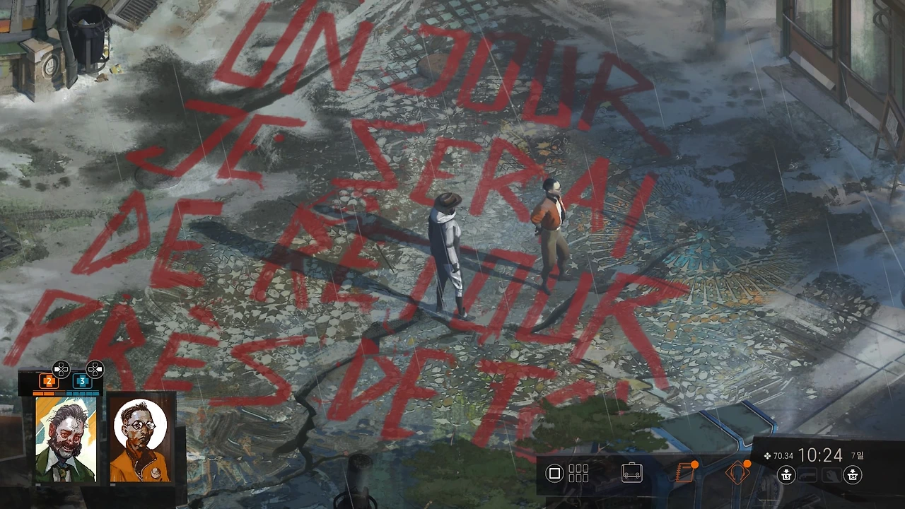 <디스코 엘리시움>은 형사버디물이란 틀을 통해 세상과 사람들 그리고 나아가 주인공 자신을 파헤쳐나가는 군상극이자 심리극에 가깝다. 방대한 양의 텍스트에도 불구하고 갖은 은유와 수사로 메워진 지문들은 지루할 틈을 없게 만들며(종종 튀어나오는 신랄한 유머는 덤이다), 자칫 단조로울 수 있는 쿼터뷰의 아이소메트릭 그래픽을 십분 활용한 강렬한 연출은 상황을 또렷하게 각인시킨다. 무엇보다도, 건조하면서도 사려 깊은 파트너 킴 키츠라기 경위의 존재는 사건 해결 의욕을 더없이 북돋는다. 플레이어는 금세 세계관에 빠져들게 되며, 종잡을 수 없는 이야기의 끝을 향해 달려가는 동안 눈을 뗄 수 없게 된다.