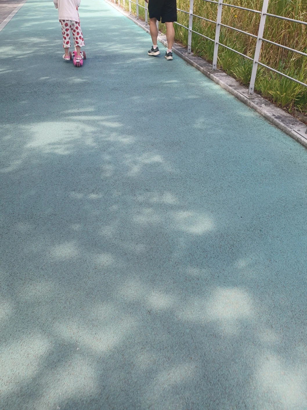 그리고 아이들에게도 엄마 아빠가 도란도란 함께 운동하는 걸 한 번 보여주고 싶다는 생각을 해봤었기에 일단 트랙을 돌기 시작했다. 직진 본능이 있는 아이들이라면 엄마 아빠 신경 쓰지 않고 쌩쌩 앞으로 나갈 법도 한데 조신하고 겁 많은 성격이라 아이는 엄마, 아빠와 발맞춰 킥보드를 운전한다. 셋이 나란히 트랙을 차지하고 걷다가 첫 달리기는 시작된다.