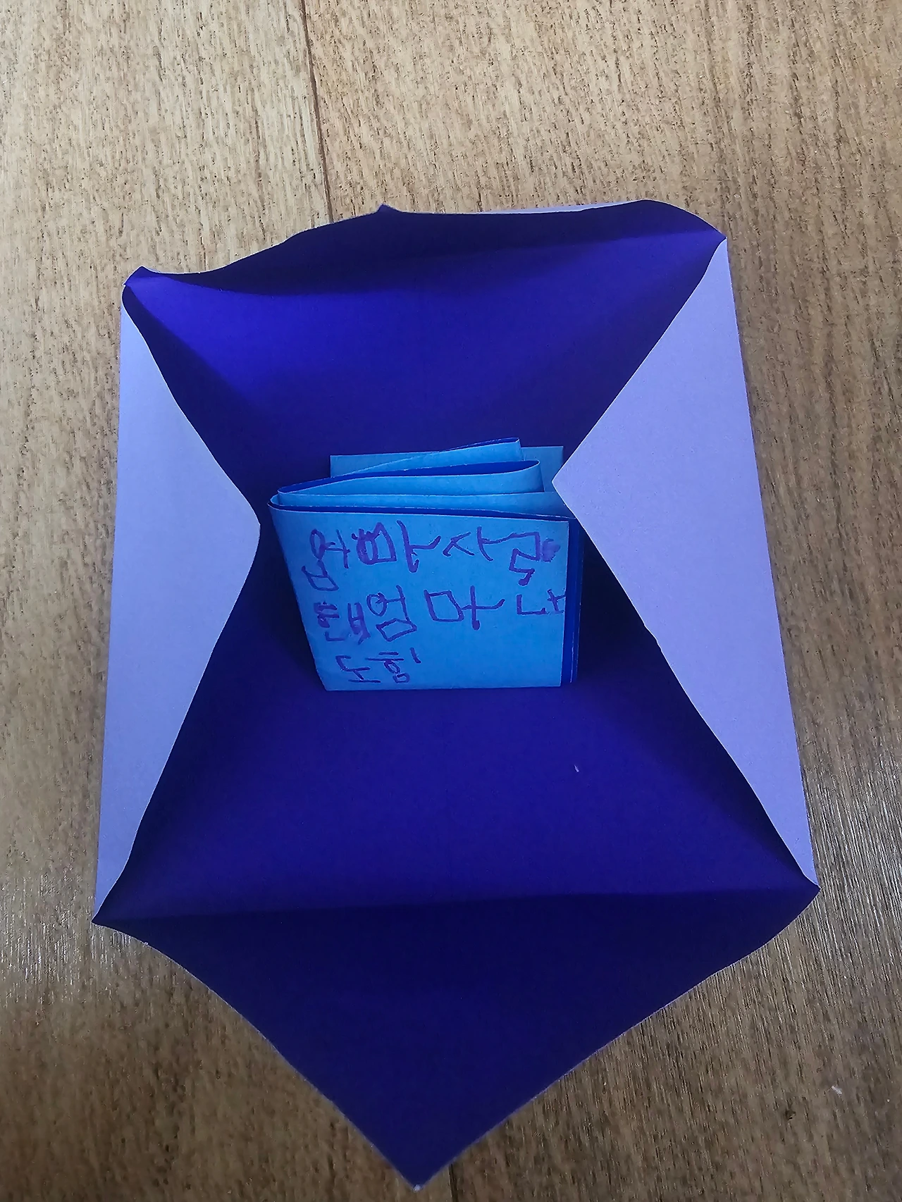 색종이 봉투 안에는 네모로 꼬깃꼬깃 접힌 편지가 있다.