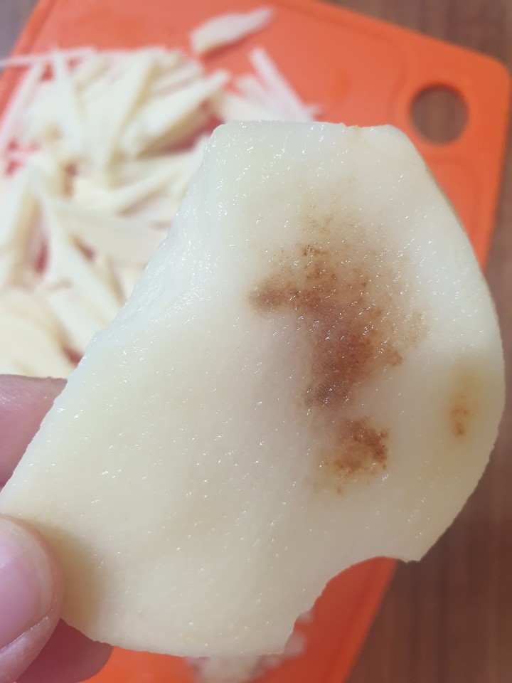저녁 반찬으로 감자볶음을 하기로 한 나는 냉장고에서 지난주 사둔 감자 3알을 꺼내 자르기 시작했다. 감자들은 모두 겉이 매끈하고 싹도 올라오지 않아 나는 만족스럽게 껍데기를 깎고 채썰기 시작했다. 한알, 두 알째 뽀얀 흰 속살을 드러내는 감자들을 반듯반듯 자르고는 전분기를 빼기 위해 물에 넣어두었다. 마지막 세 번째 감자를 자르기 시작했을 때 나는 이상한 점을 느꼈다. 자른 단면이 뽀얗지 않고 거뭇거뭇했다.