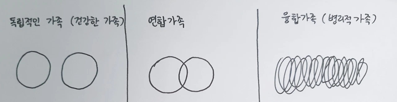 제일 왼쪽부터 독립된 가정, 연합 가족, 융합 가족(병리적 가족)