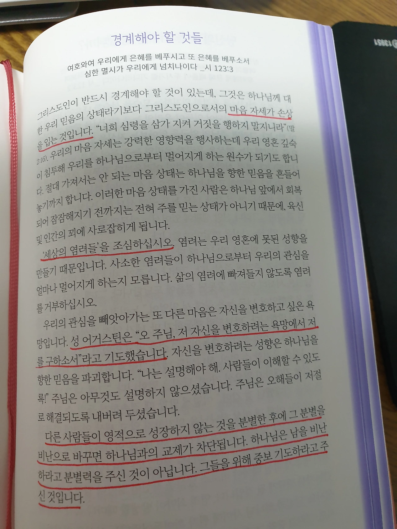 '세상의 염려들'을 조심하십시오. 염려는 영혼에 못된 성향을 만들기 때문입니다. 사소한 염려들이 하나님으로부터 우리의 관심을 얼마나 멀어지게 하는지 모릅니다. 삶의 염려에 빠져들지 않도록 염려를 거부하십시오.