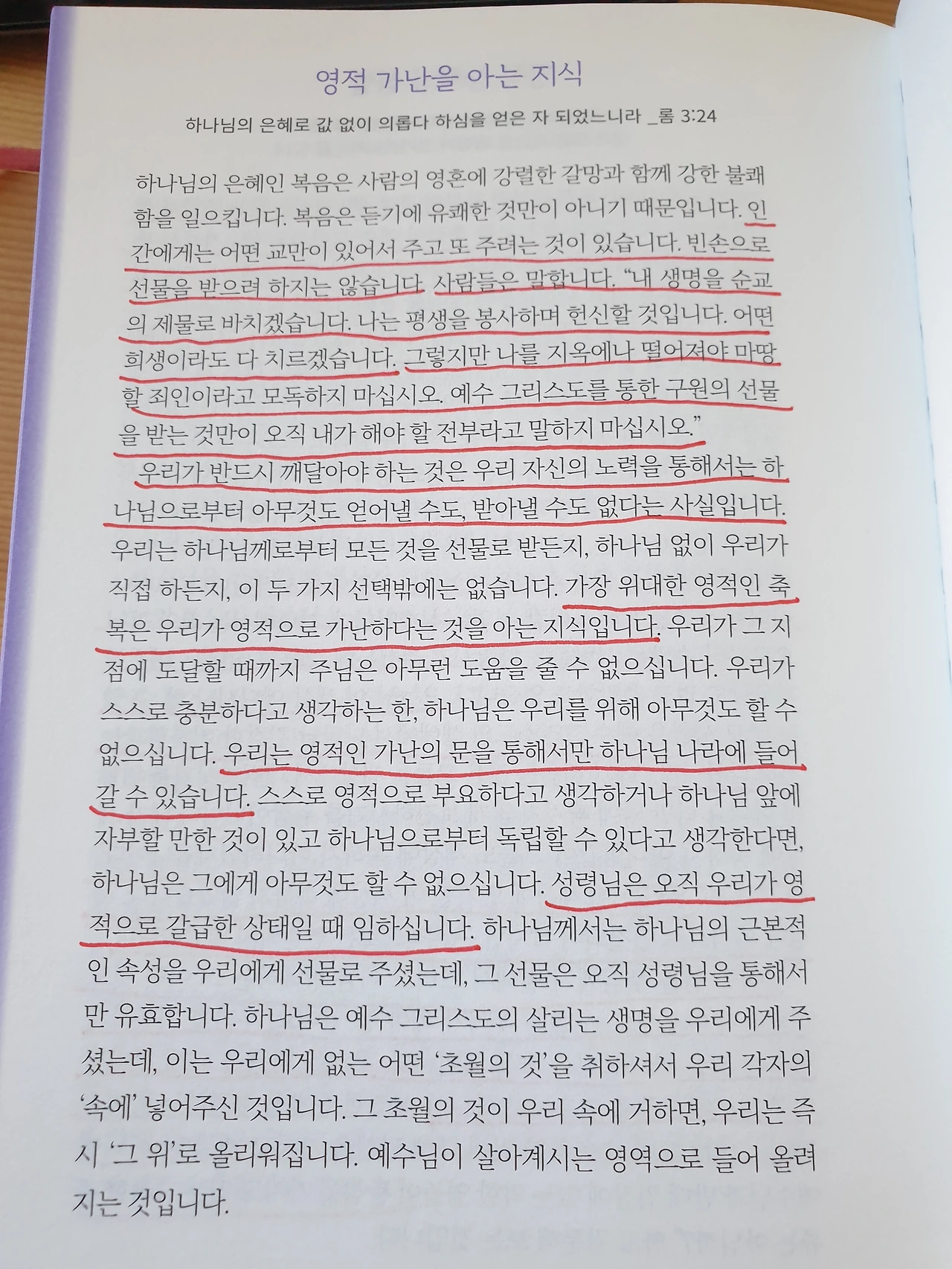 우리가 반드시 깨달아야 하는 것은 우리 자신의 노력을 통해서는 하나님으로부터 아무것도 얻어낼 수도 받아낼 수도 없다는 사실입니다. 가장 위대한 영적인 축복은 우리가 영적으로 가난하다는 것을 아는 지식입니다. 우리는 영적인 가난의 문을 통해서만 하나님 나라에 들어갈 수 있습니다.