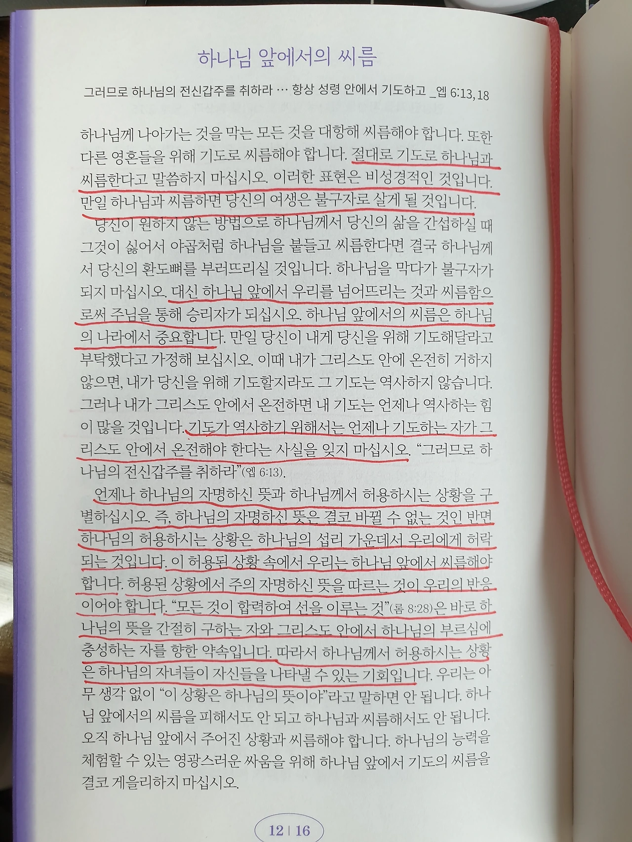 절대로 기도로 하나님과 씨름한다고 말씀하지 마십시오. 이러한 표현은 비성경적인 것입니다. 만일 하나님과 씨름하면 당신의 여생은 불구자로 살게 될 것입니다. 대신 하나님 앞에서 우리를 넘어뜨리는 것과 씨름함으로써 주님을 통해 승리자가 되십시오. 하나님 앞에서의 씨름은 하나님 나라에서 중요합니다.