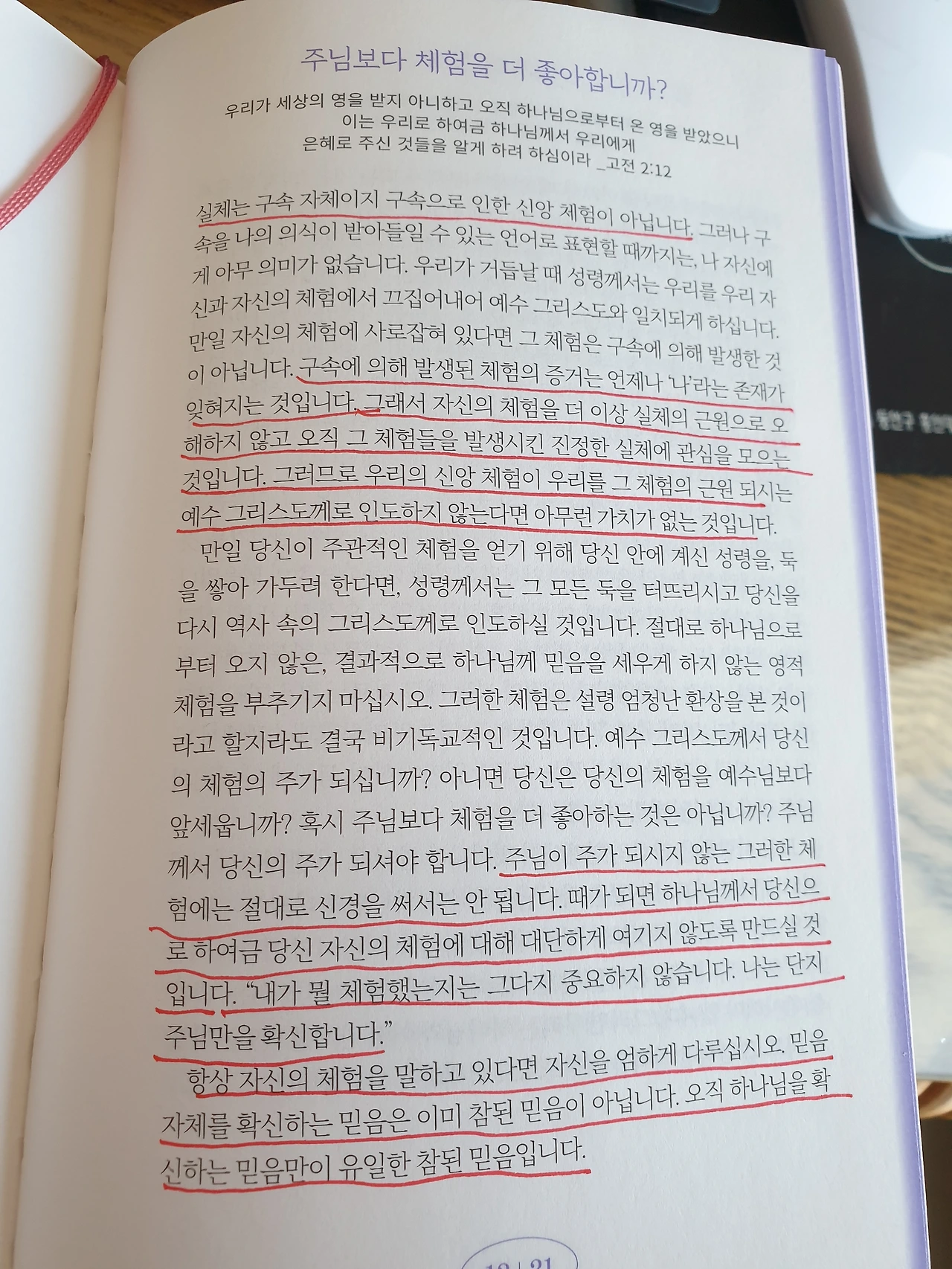실체는 구속 자체이지 구속으로 인한 신앙 체험이 아닙니다. 구속에 의해 발생된 체험의 증거는 언제나 '나'라는 존재가 잊혀지는 것입니다. 그래서 자신의 체험을 더 이상 실체의 근원으로 오해하지 않고 오직 그 체험들을 발생시킨 진정한 실체에 관심을 모으는 것입니다. 그러므로 우리 신앙 체험이 우리를 그 체험의 근원 되시는 예수 그리스도께로 인도하지 않는다면 아무런 가치가 없는 것입니다.