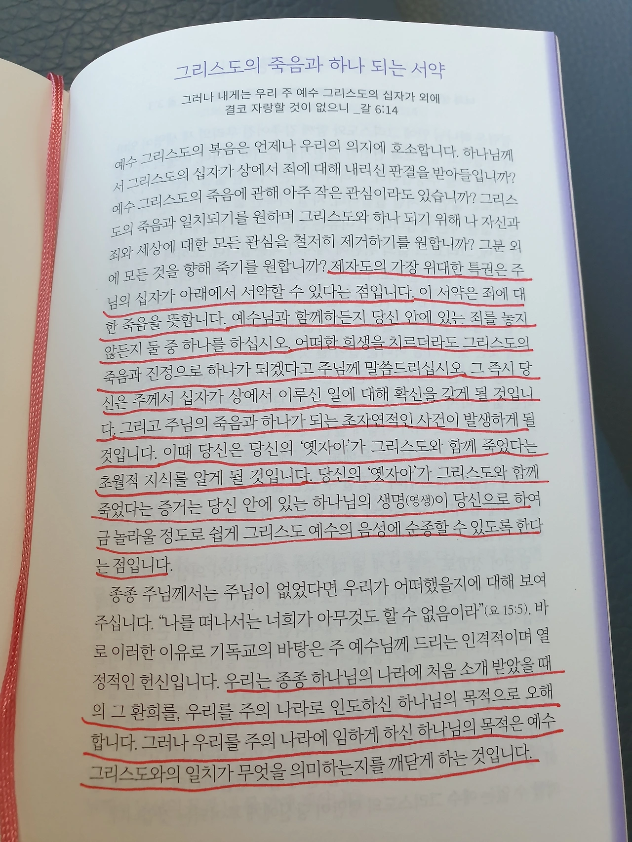 제자도의 가장 위대한 특권은 주님의 십자가 아래에서 서약할 수 있다는 점입니다. 이 서약은 죄에 대한 죽음을 뜻합니다. 예수님과 함께하든지 당신 안에 있는 죄를 놓지 않든지 둘 중 하나를 하십시오. 어떠한 희생을 치르더라도 그리스도의 죽음과 진정으로 하나가 되겠다고 주님께 말씀드리십시오. 그 즉시 당신은 주께서 십자가 상에서 이루신 일에 대해 확신을 갖게 될 것입니다. 그리고 주님의 죽음과 하나가 되는 초자연적인 사건이 발생하게 될 것입니다. 이때 당신은 당신의 '옛 자아'가 그리스도와 함께 죽었다는 초월적 지식을 알게 될 것입니다. 당신의 '옛 자아'가 그리스도와 함께 죽었다는 증거는 당신 안에 있는 하나님의 생명(영생)이 당신으로 하여금 놀라울 정도로 쉽게 그리스도 예수의 음성에 순종할 수 있도록 한다는 점입니다.