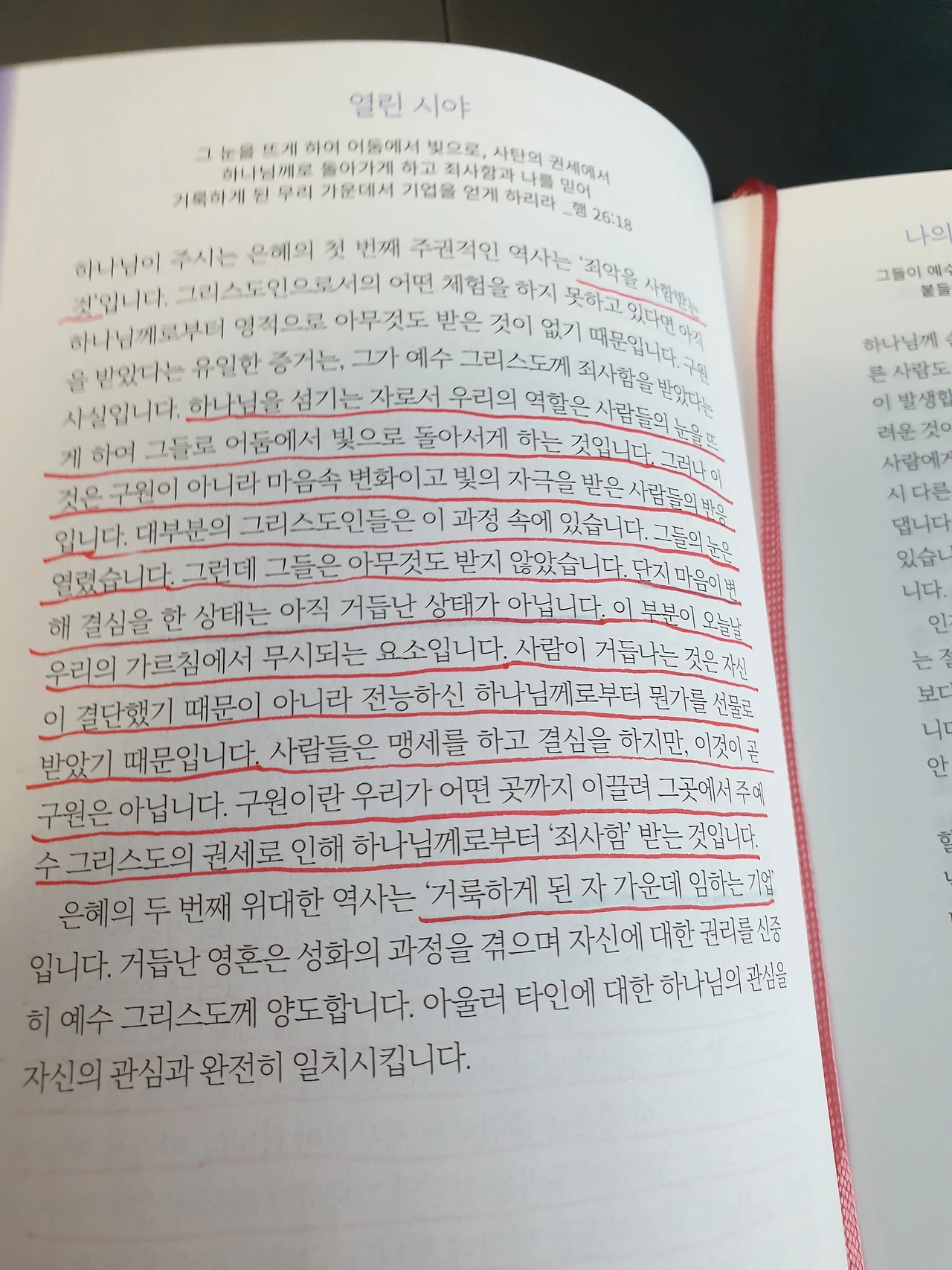 하나님을 섬기는 자로서 우리의 역할은 사람들의 눈을 뜨게 하여 그들로 어둠에서 빛으로 돌아서게 하는 것입니다. 그러나 이것은 구원이 아니라 마음속 변화이고 빛의 자극을 받은 사람들의 반응입니다. 대부분의 그리스도인들은 이 과정 속에 있습니다. 그들의 눈은 열렸습니다. 그런데 그들은 아무것도 받지 않았습니다. 단지 마음이 변해 결심을 한 상태는 아직 거듭난 상태가 아닙니다. 이 부분이 오늘날 우리의 가르침에서 무시되는 요소입니다. 사람이 거듭나는 것은 자신이 결단했기 때문이 아니라 전능하신 하나님께로부터 뭔가를 선물로 받았기 때문입니다. 사람들은 맹세를 하고 결심을 하지만 이것이 곧 구원은 아닙니다. 구원이란 우리가 어떤 곳까지 이끌려 그곳에서 주 예수 그리스도의 권세로 인해 하나님께로부터 '죄 사함' 받는 것입니다.