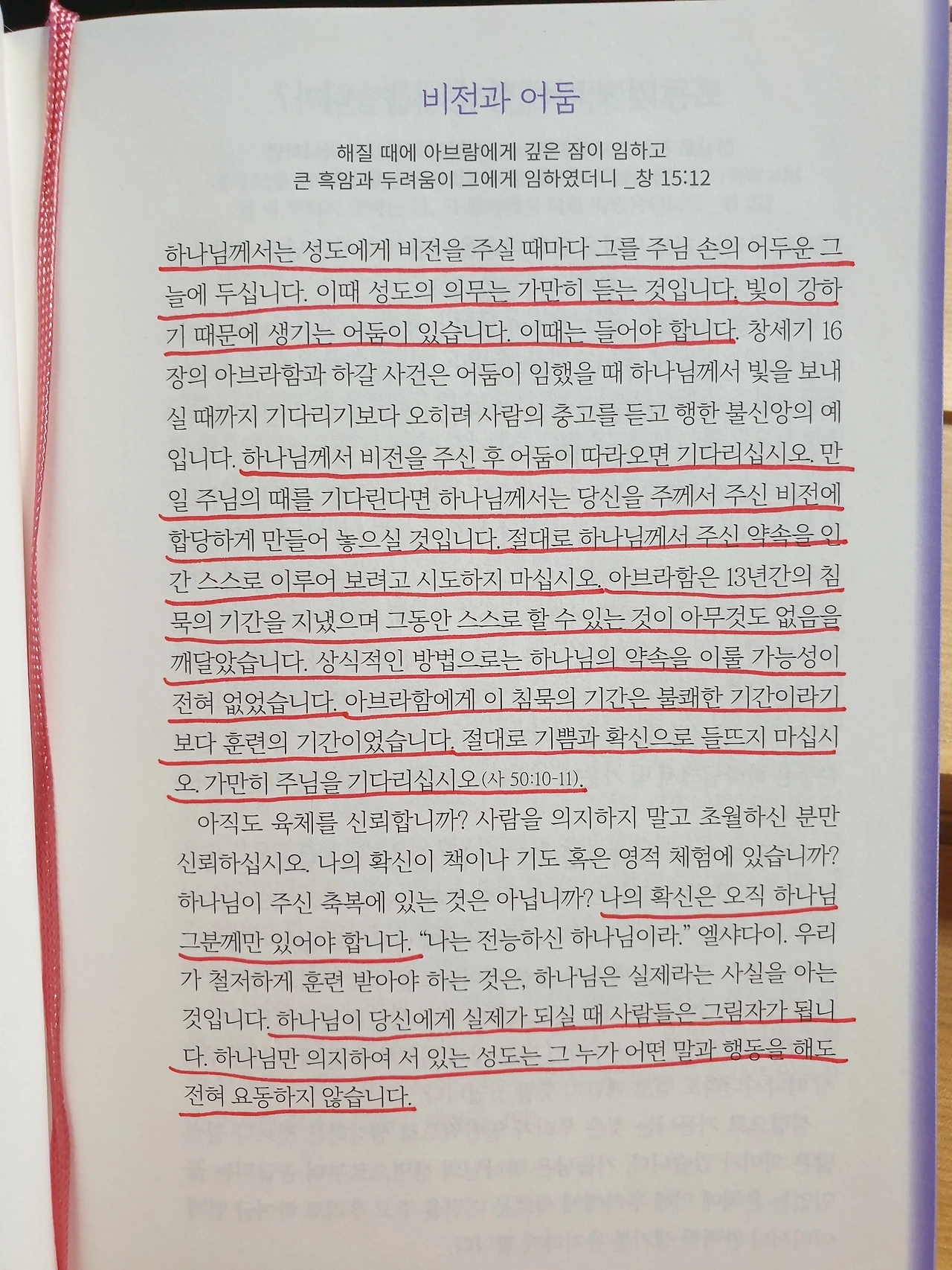 하나님께서 비전을 주신 후 어둠이 따라오면 기다리십시오. 만일 주님의 때를 기다린다면 하나님께서는 당신을 주께서 주신 비전에 합당하게 만들어 놓으실 것입니다. 절대로 하나님께서 주신 약속을 인간 스스로 이루어 보려고 시도하지 마십시오. 아브라함은 침묵의 기간을 지냈으며 그동안 스스로 할 수 있는 것이 아무것도 없음을 깨달았습니다. 상식적인 방법으로는 하나님의 약속을 이룰 가능성이 전혀 없었습니다. 아브라함에게 이 침묵의 기간은 불쾌한 기간이라기보다 훈련의 기간이었습니다. 절대로 기쁨과 확신으로 들뜨지 마십시오. 가만히 주님을 기다리십시오.(사 50:10~11)