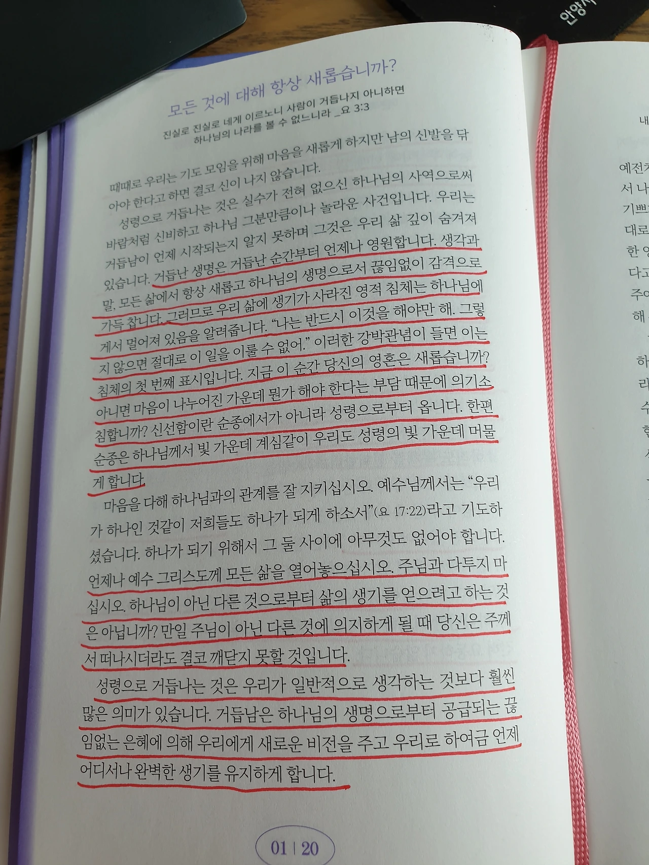 지금 이 순간 당신의 영혼은 새롭습니까? 아니면 마음이 나누어진 가운데 뭔가 해야 한다는 부담 때문에 의기소침합니까? 신선함이란 순종에서가 아니라 성령으로부터 옵니다. 한편 순종은 하나님께서 빛 가운데 계심같이 우리도 성령의 빛 가운데 머물게 합니다. 언제나 예수 그리스도께 모든 삶을 열어놓으십시오. 주님과 다투지 마십시오. 하나님이 아닌 다른 것에 의지하게 될 때 당신은 주께서 떠나시더라도 결코 깨닫지 못할 것입니다.