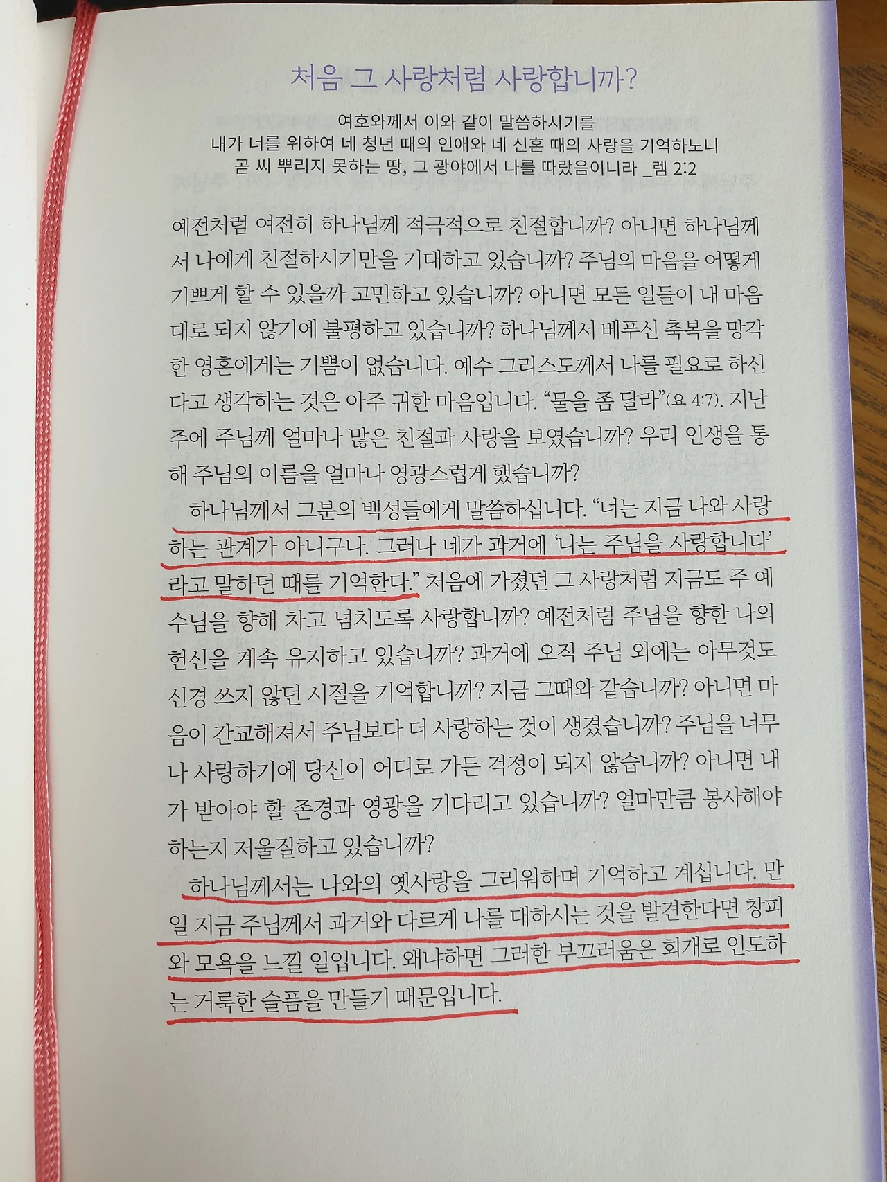 하나님께서는 나와의 옛사랑을 그리워하며 기억하고 계십니다. 만일 지금 주님께서 과거와 다르게 나를 대하시는 것을 발견한다면 창피와 모욕을 느낄 일입니다. 왜냐하면 그러한 부끄러움은 회개로 인도하는 거룩한 슬픔을 만들기 때문입니다.