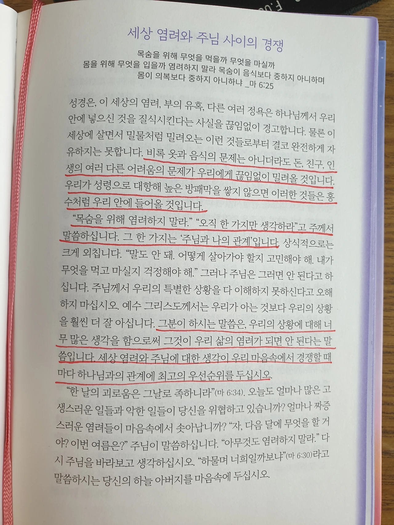 그분이 하시는 말씀은 우리의 상황에 대해 너무 많은 생각을 함으로써 그것이 우리 삶의 염려가 되면 안 된다는 말씀입니다. 세상 염려와 주님에 대한 생각이 우리 마음속에 경쟁할 때마다 하나님과의 관계에 최고의 우선순위를 두십시오.