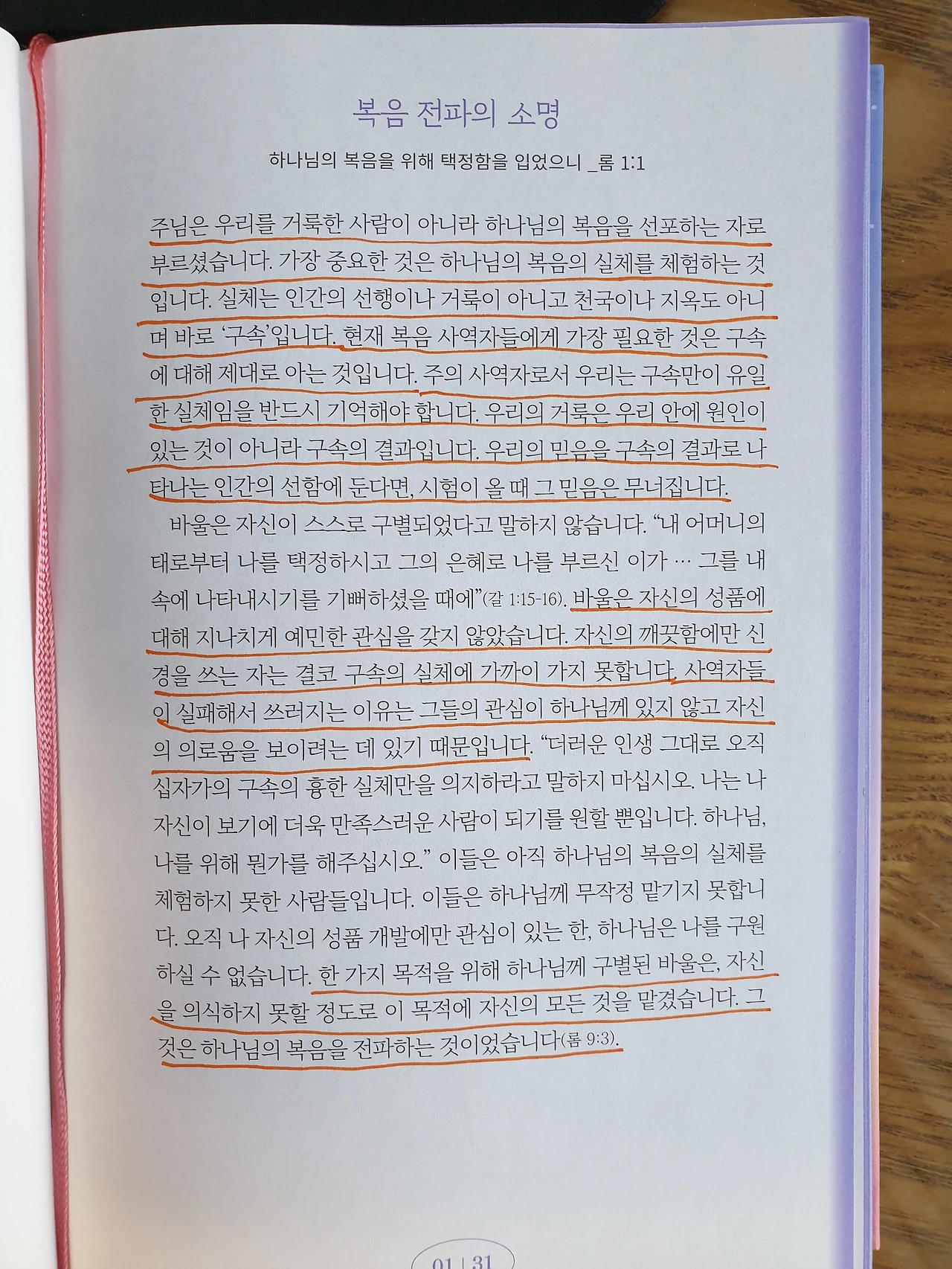 주님은 우리를 거룩한 사람이 아니라 하나니의 복음을 선포하는 자로 부르셨습니다. 가장 중요한 것은 하나님의 복음의 실체를 체험하는 것입니다. 실체는 인간의 선행이나 거룩이 아니고 천국이나 지옥도 아니며 바로 '구속'입니다. 현재 복음 사역자들에게 가장 필요한 것은 구속에 대해 제대로 아는 것입니다. 주의 사역자로서 우리는 구속만이 유일한 실체임을 반드시 기억해야 합니다 우리의 거룩은 우리 안에 원인이 있는 것이 아니라 구속의 결과입니다. -오스왈드 챔버스 365 묵상집 중에서 발췌-