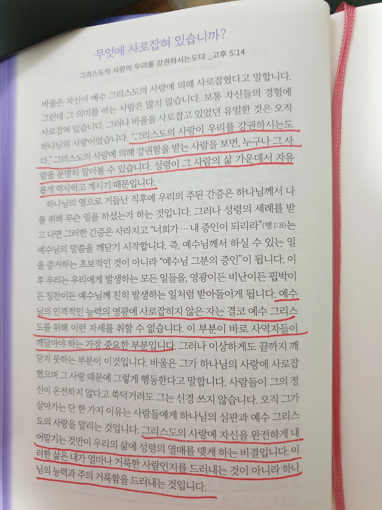 그리스도의 사랑에 의해 강권함을 받는 사람을 보면 누구나 그 사람을 분명히 알아볼 수 있습니다. 성령이 그 사람의 삶 가운데서 자유롭게 역사하고 계시기 때문입니다.