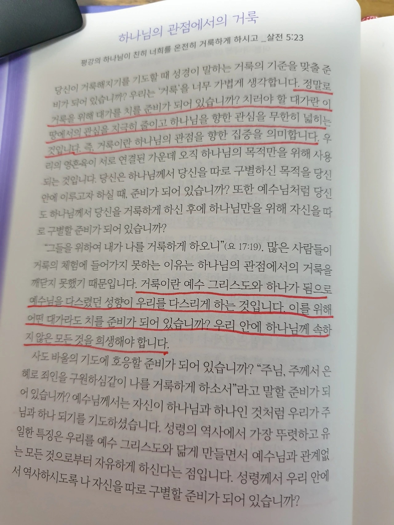 정말로 거룩을 위해 대가를 치를 준비가 되어 있습니까? 치러야 할 대가란 이 땅에서의 관심을 지극히 줄이고 하나님을 향한 관심을 무한히 넓히는 것입니다. 즉, 거룩이란 하나님의 관점을 향한 집중을 의미합니다. 거룩이란 예수 그리스도와 하나가 됨으로 예수님을 다스렸던 성향이 우리를 다스리게 하는 것입니다. 이를 위해 어떤 대가라도 치를 준비가 되어 있습니까? 우리 안에 하나님께 속하지 않은 모든 것을 희생해야 합니다.