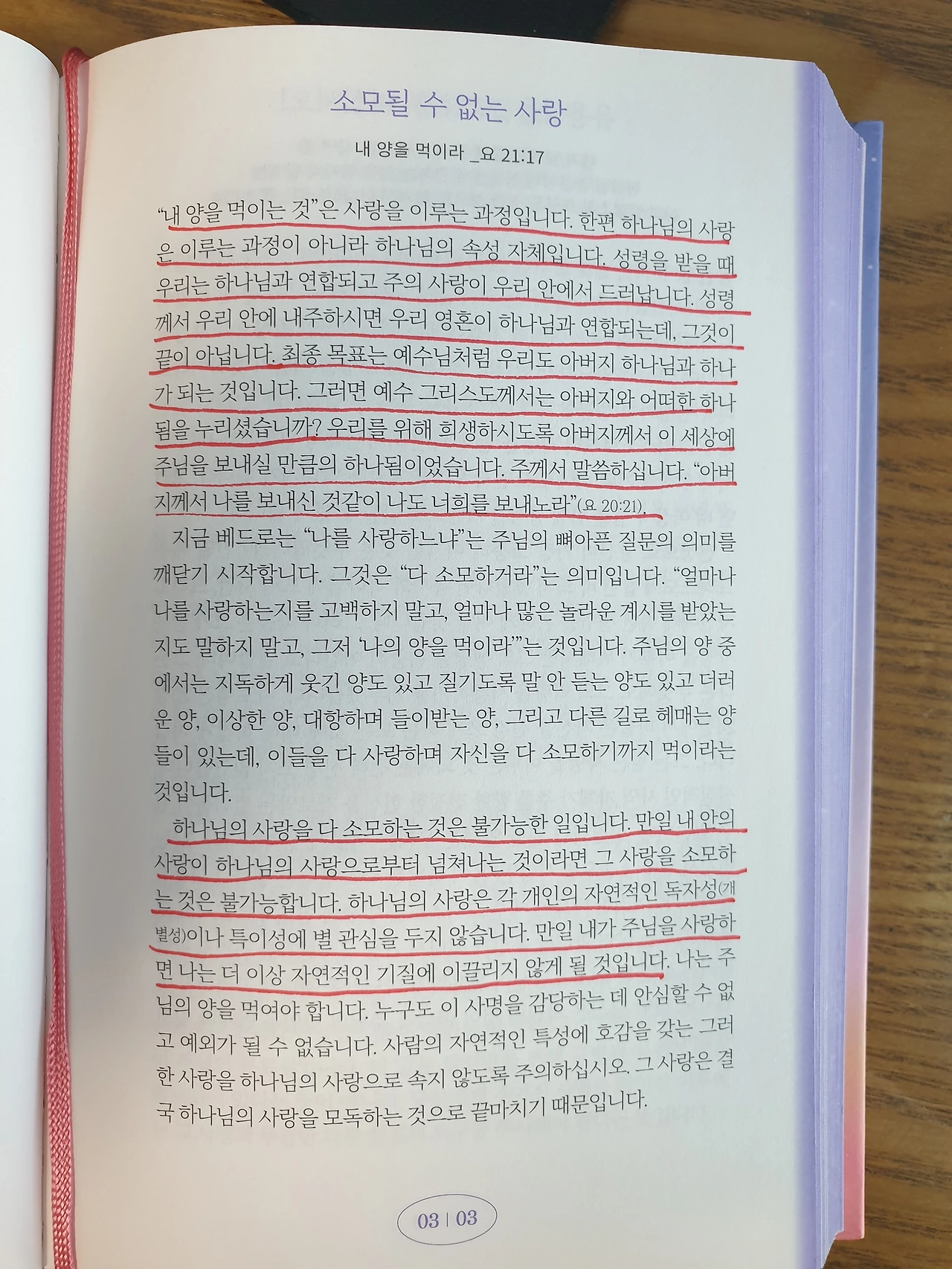 하나님의 사랑을 다 소모하는 것은 불가능한 일입니다. 만일 내 안의 사랑이 하나님의 사랑으로부터 넘쳐나는 것이라면 그 사랑을 소모하는 것은 불가능합니다. 하나님의 사랑은 각 개인의 자연적인 독자성이나 특이성에 별 관심을 두지 않습니다. 만일 내가 주님을 사랑하면 나는 더 이상 자연적인 기질에 이끌리지 않게 될 것입니다.