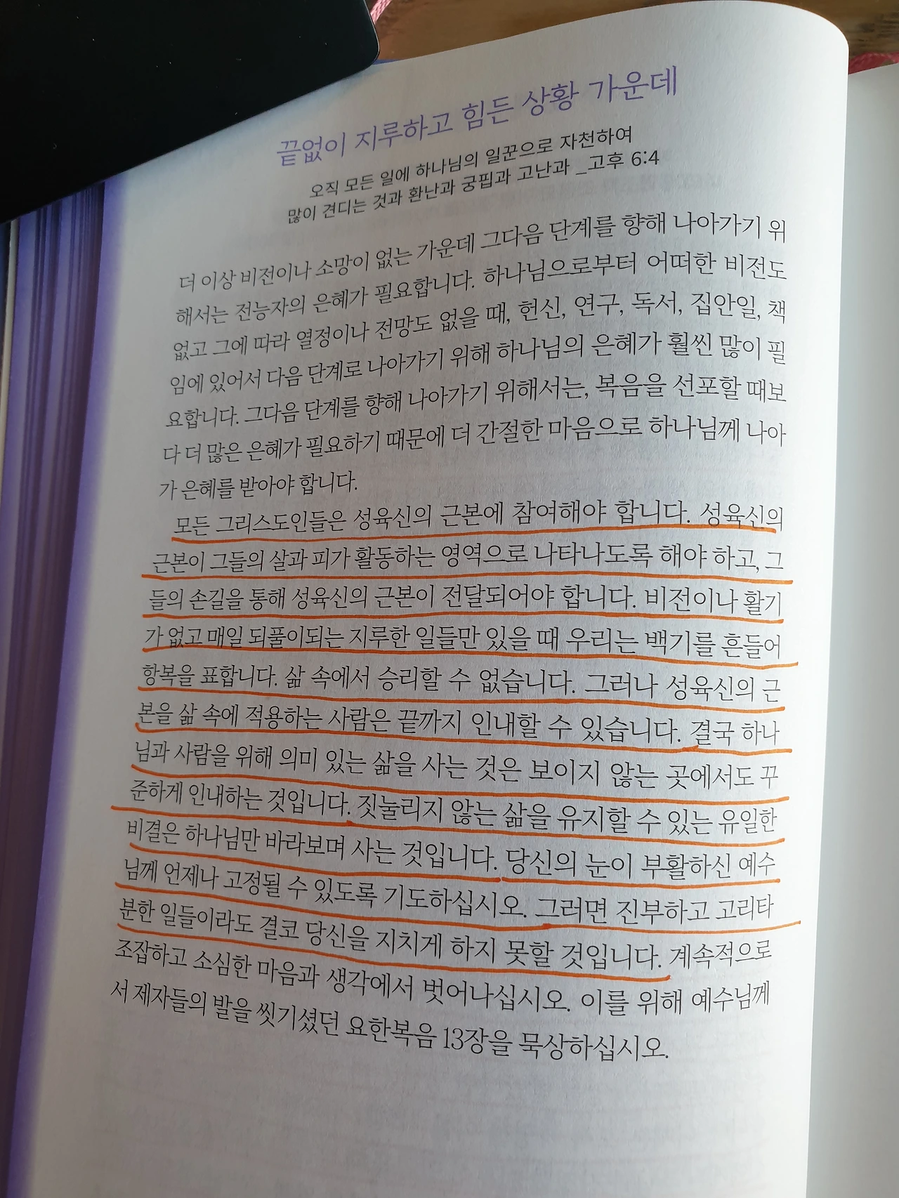 모든 그리스도인들은 성육신의 근본에 참여해야 합니다. 성육신의 근본이 그들의 살과 피가 활동하는 영역으로 나타나도록 해야 하고, 그들의 손길을 통해 성육신의 근본이 전달되어야 합니다. 비전이나 활기가 없고 매일 되풀이되는 지루한 일들만 있을 때 우리는 백기를 흔들어 항복을 표합니다. 삶 속에서 승리할 수 없습니다. 그러나 성육신의 근본을 삶 속에 적용하는 사람은 끝까지 인내할 수 있습니다. 결국 하나님과 사람을 위해 의미 있는 삶을 사는 것은 보이지 않는 곳에서도 꾸준하게 인내하는 것입니다. 짓눌리지 않는 삶을 유지할 수 있는 유일한 비결은 하나님만 바라보며 사는 것입니다. 당신의 눈이 부활하신 예수님께 언제나 고정될 수 있도록 기도하십시오. 그러면 진부하고 고리타분한 일들이라도 결코 당신을 지치게 하지 못할 것입니다.