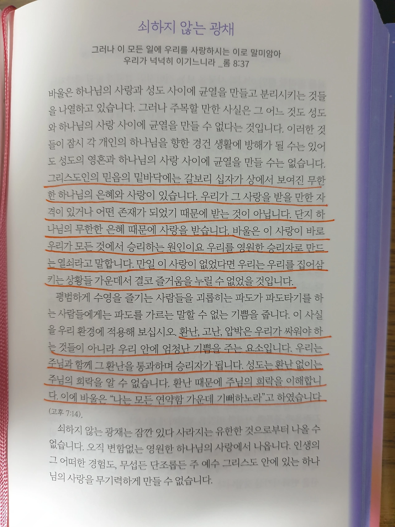 쇠하지 않는 광채는 잠깐 있다 사라지는 유한한 것으로부터 나올 수 없습니다. 오직 변함없는 영원한 하나님의 사랑에서 나옵니다. 인생의 그 어떠한 경험도, 무섭든 단조롭든 주 예수 그리스도 안에 있는 하나님의 사랑을 무기력하게 만들 수 없습니다.
